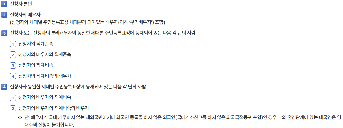 – 노부모 부양, 장애인, 다자녀가구, 국가유공자, 영구임대주택 입주자 중 자격상실자, 비닐간이공작물 거주자, 신혼부부, 사업지구 철거민, 무허가 건축물 등에 입주한 세입자 등
