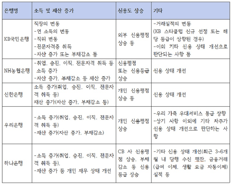 기타 요인: 예를 들어, 당행의 거래 실적이 좋아지거나 기타 신용상태가 개선되었다면 신청이 가능합니다.