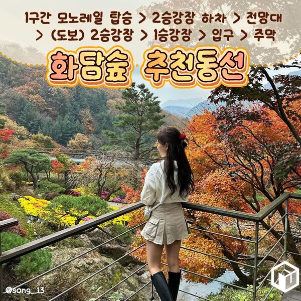 여행톡톡이 추천하는 2024 화담숲 단풍시기 관람 코스는 다음과 같습니다. 오르막길인 1구간 모노레일을 탑승해 2승장장에서 하차해 전망대까지 산책하며 단풍사이로 모노레일이 지나가는 풍경과 포토존에서 사진을 찍으며 시간을 보냅니다.