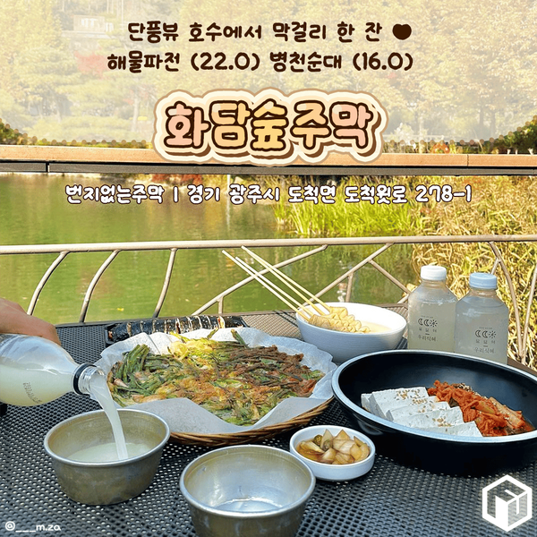 화담숲은 내부에 식당과 매점, 편의점이 있어 외부 음식은 반입이 금지됩니다. 입출구 인근 원앙연못 앞 '번지없는 주막'은 호수를 전망으로 야외 좌석에서 해물파전과 막걸리 등을 즐길 수 있으니 참고하시면 되겠습니다.