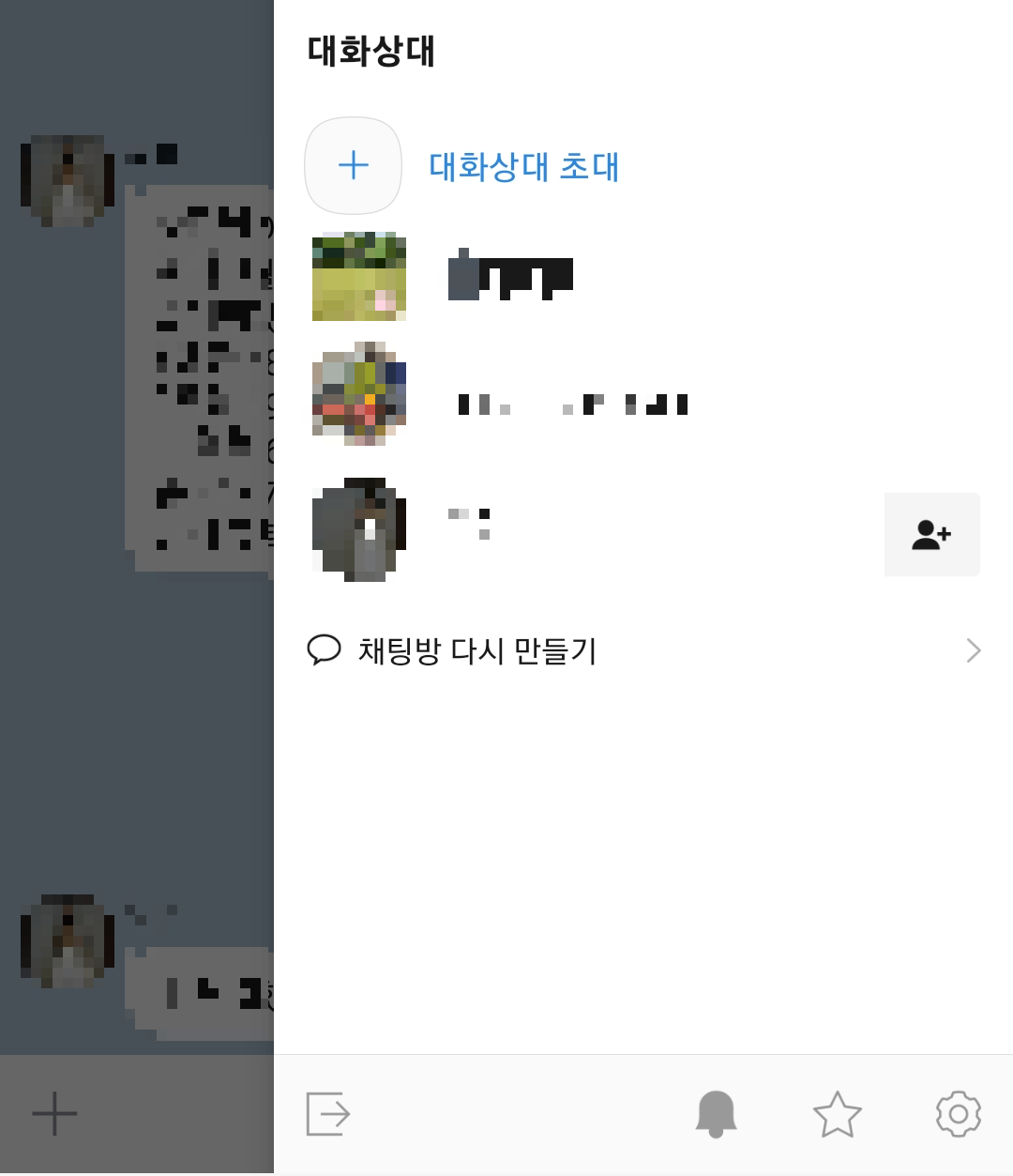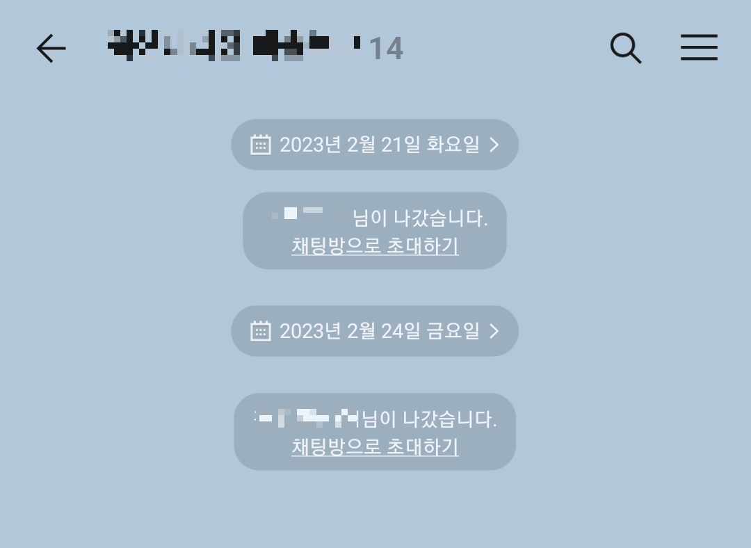채팅방에 들어가면 우측 상단에 세 줄로 된 메뉴 버튼을 클릭합니다. 그러면 아래 사진처럼 채팅방 서랍 메뉴가 나타납니다.