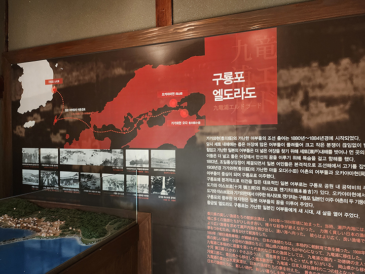 이곳이 포항 구룡포 일본인 가옥거리 ‘근대문화 역사관’이니 그와 관련한 정보가 어딘가엔 있을 거라 생각하셨을 테고 이 공간이 바로 그러한 공간이다. 일본인들이 구룡포에 오게 된 경로와 오게 된 이유 등을 알아볼 수 있고 당시 사용했던 자기 술 항아리 등의 집기, 구룡포에 전해지는 전설, 1930년대 구룡포의 축소모형 등을 볼 수 있다.