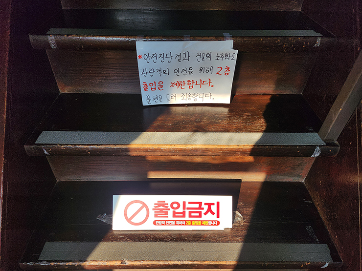 예전엔 2층까지 올라갈 수 있었으나 안전진단 결과 관리를 해야 한다 판단되어 2024년엔 출입금지.