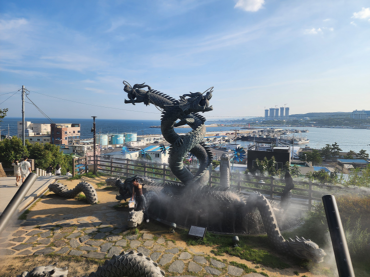 그렇게 어슬렁 주변 구경을 마치고 용이 여의주를 물고 싸우는 것인지 어울리는 것인지 모르겠으나 배배 꼬며 고개를 쳐든 조형물을 만날 수 있다. 많은 분들이 기념사진 촬영하는 장소이니 꼭 들러보시기 바라며 가만 보고 있으면 꽤 멋있다고 생각된다. 그리고 용의 머릿수를 세어보면 구룡.