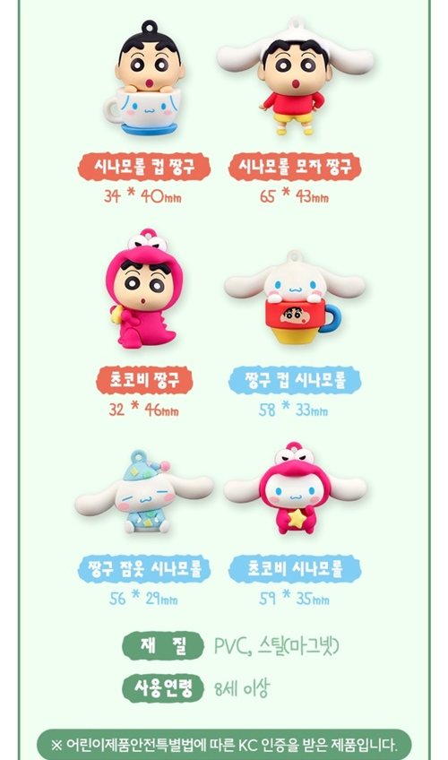 짱구와 시나모롤 인형 키링 2종은 제조 음료 포함 8천원 이상 구매 시 7,900원에 추가 구매할 수 있습니다. 짱구는 11CM, 시나모롤은 9CM 크기로 귀여움을 자랑합니다.