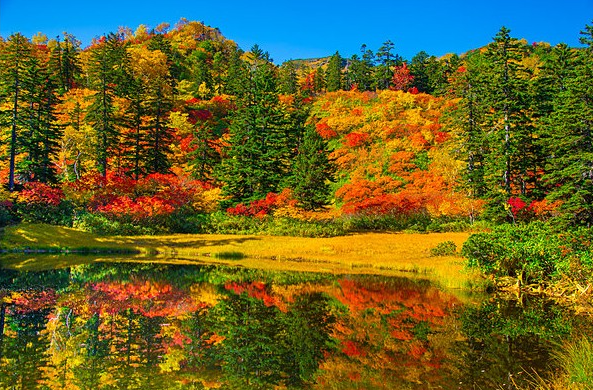 다이세츠산 국립공원: 홋카이도에서 가장 유명한 단풍 명소 중 하나로 높은 곳에 위치해 이르면 9월 말부터 산과 계곡을 따라 노랑 빨강으로 물드는 장엄한 단풍을 만날 수 있습니다. 특히 수면에 비치는 단풍나무의 모습은 환상적입니다.