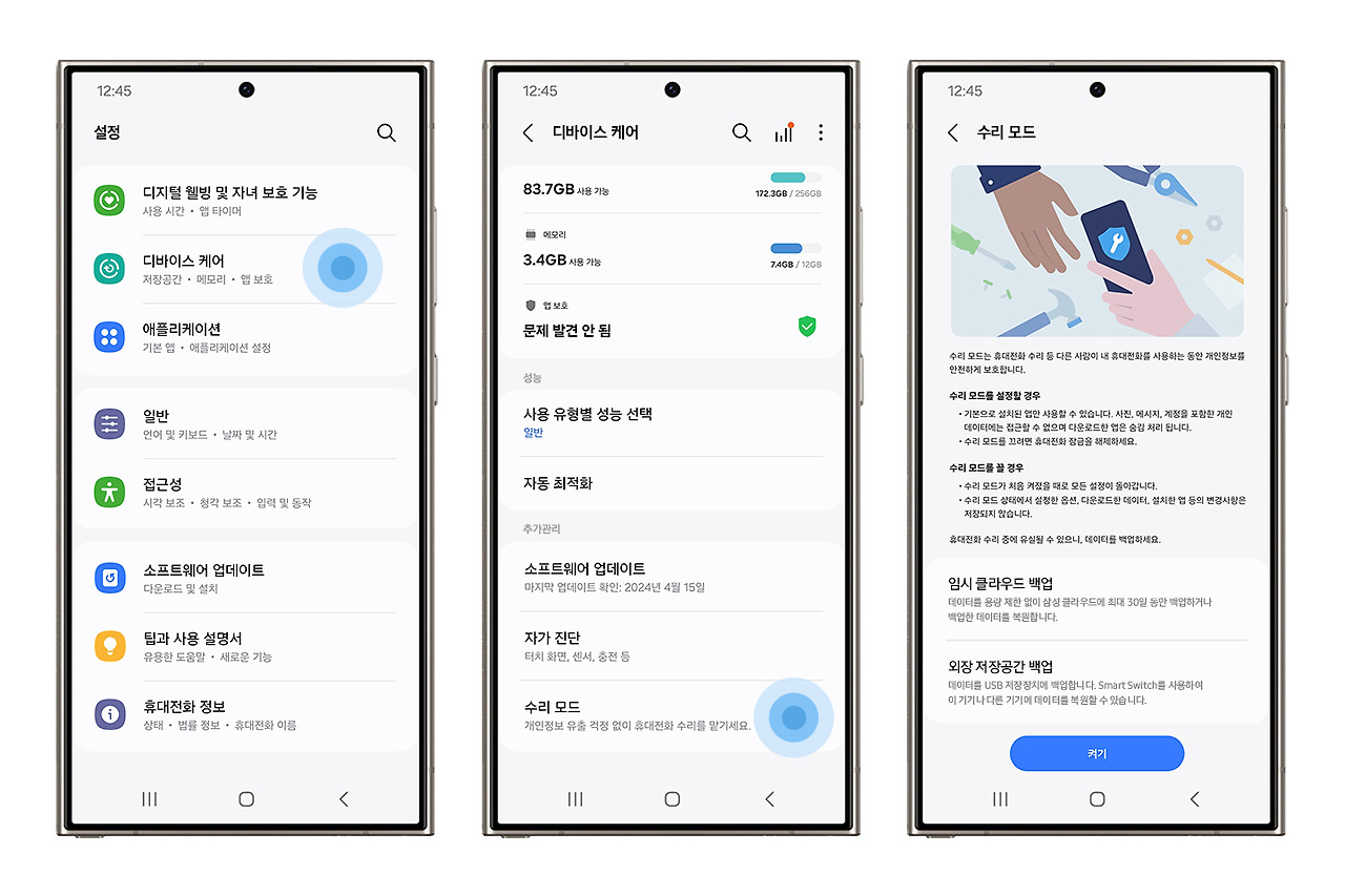 설정 > 디바이스 케어 > 수리모드 > ‘수리모드 켜기’