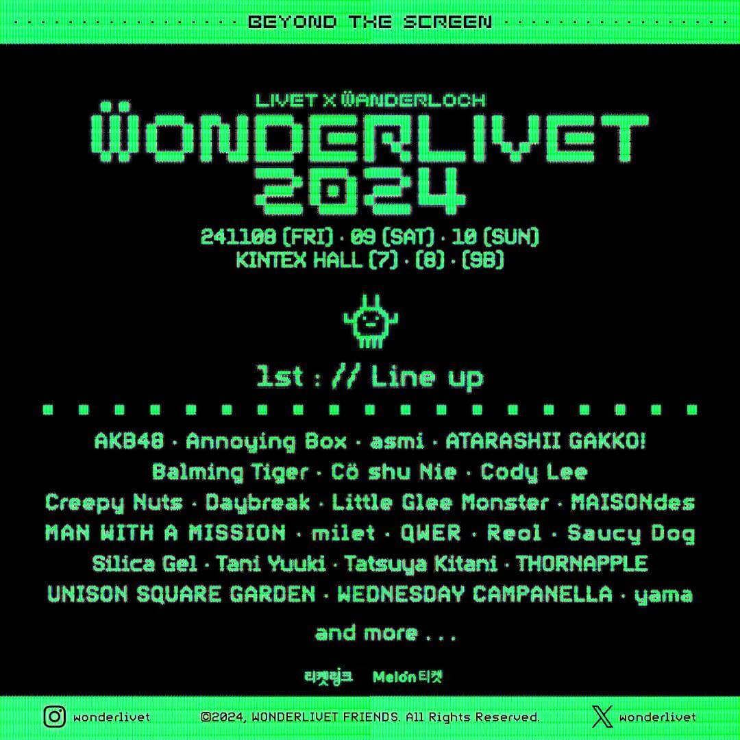 이번 원더리벳 2024는 일본의 인기 J-POP 아티스트들과 국내 유명 아티스트들이 함께하는 대규모 라인업으로 구성되어 있습니다. 현재 1차 라인업이 발표되었으며, 2차 라인업은 추후 공식 SNS를 통해 공개될 예정입니다.