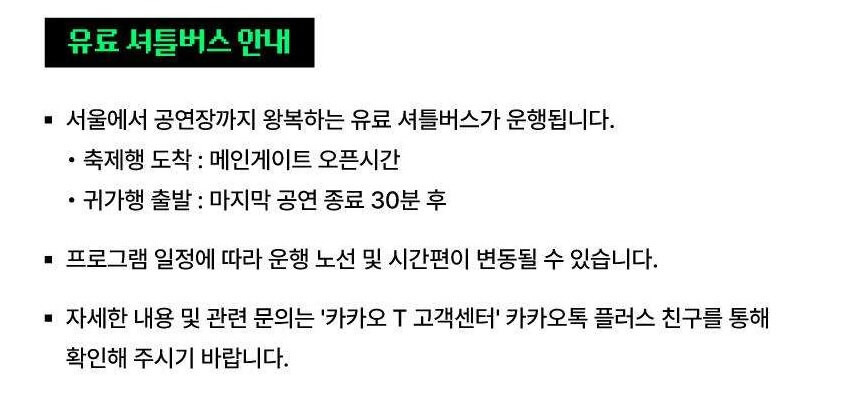 원더리벳 2024 페스티벌 기간 동안 공연장과 수도권을 왕복하는 셔틀버스가 운영될 예정입니다. 자세한 예약 방법은 추후 공지될 예정입니다.