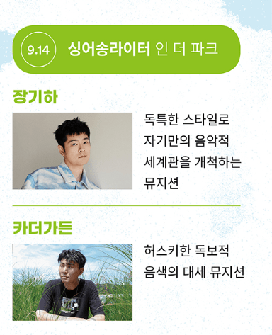 음악과 가사를 직접 쓰는 싱어송라이터들이 무대를 채우는 날입니다. 장기하와 카더가든(Car, the garden)이 그들의 독특한 스타일로 중앙공원을 가득 채울 것입니다.