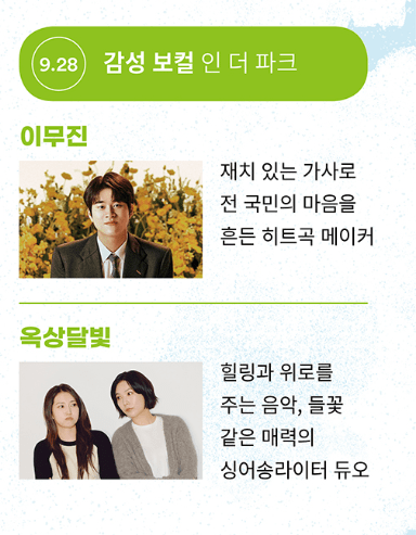 가을의 감성을 자극하는 보컬리스트들의 무대. 이무진과 옥상달빛이 분당의 가을 밤을 따뜻하게 물들일 것입니다.