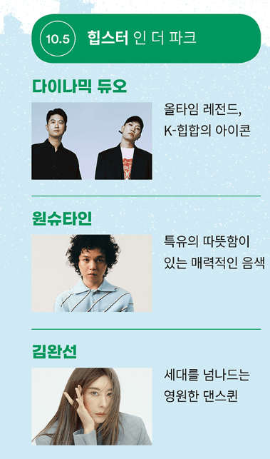 힙합과 레트로 음악이 어우러진 마지막 공연날! 다이나믹 듀오, 원슈타인, 김완선이 화려한 무대로 관객들을 매료시킬 예정입니다.