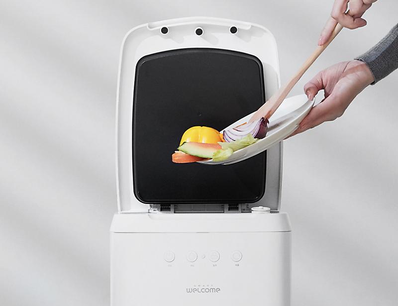 '스마트웰컴 미생물 음식물 처리기'는 자동 배양 미생 물로 매일 최대 1.5 kg 의 음식물 쓰레기를 처리할 수 있는 제품이다. 국내 최초로 내용물을 삽으로 퍼낼 필 요 없이 간편하게 버릴 수 있는 배출 기능을 탑재했 다. 6중 스마트 탈취 시스템을 적용해 냄새가 퍼질 걱 정을 하지 않아도 되며, 폭이 25 cm에 지나지 않기에 어느 곳에 둬도 공간을 많이 차지하지 않아 편리하다.