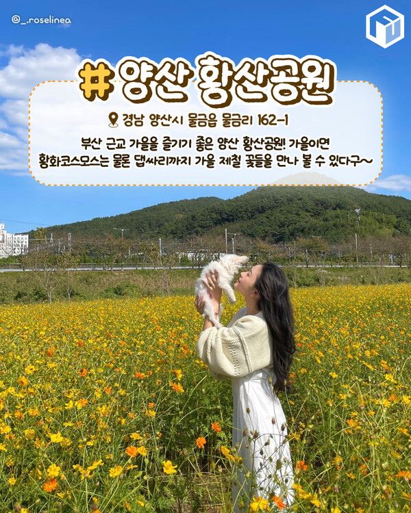 부산 근교 가을을 즐기기 좋은 양산 황산공원은 여름이면 고고한 연꽃이 가을에는 알록달고한 코스모스, 댑싸리가 만개해 가을을 느끼기 좋습니다. 특히 황산공원은 조경과 산책로가 잘 조성되어 있어 산책과 피크닉을 즐기기 좋아 가을 꽃놀이 명소로 추천립니다.