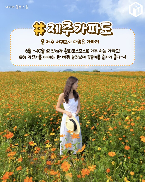 가을 온 섬이 주황빛으로 물드는 제주 가파도입니다. 제주도 부속섬 중 4번째로 큰 가파도는 6월부터 10월까지 주황빛 황화 코스모스를 만나볼 수 있어 제주 가을 꽃 놀이 여행으로 제격인데요.