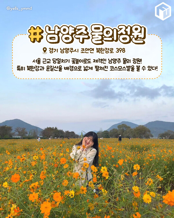 북한강과 운길산을 배경으로 넓게 펼쳐진 코스모스 꽃밭을 만나볼 수 있는 남양주 물의 정원입니다. 서울과도 가까워 당일치기 꽃놀이로 방문하기도 좋데요.