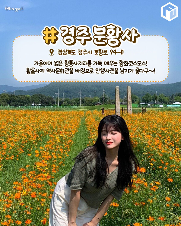 4계절마다 다른 매력을 풍기는 경주는 가을이면 알록달록한 색감이 더해져 더욱 화사하고 화려한 모습이 가득한 국내 여행지입니다. 특히 가을 경주 분황사가 있는 화룡사지터는 주황빛 황화 코스모스가 만개해 화려한 볼거리를 선사합니다.