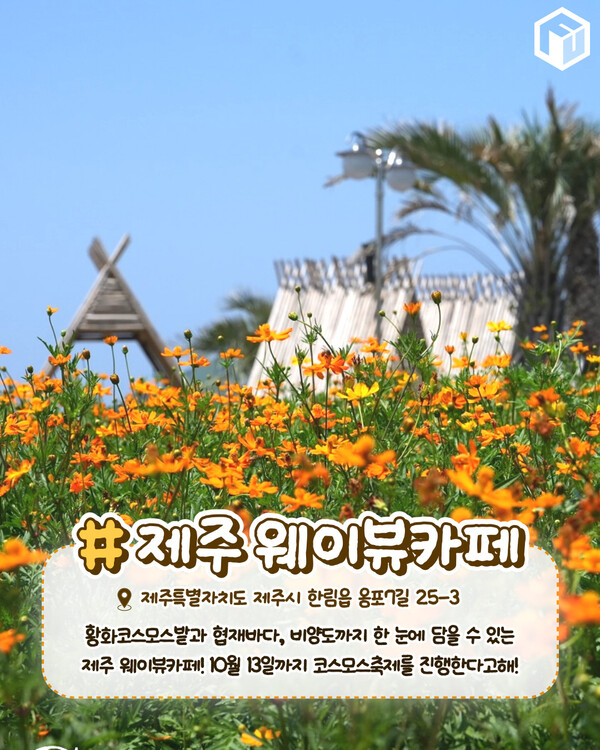 맑고 푸른 제주 바다와 주황빛 코스모스가 대조되어 특별한 가을 풍경을 만나볼 수 있는 제주 웨이뷰 카페입니다. 제주 협재 바다 바로 앞에 위치한 대형 카페 웨이뷰는 계절별 꽃 축제를 진행하는데요.
