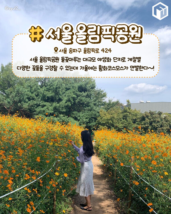 서울 도심 속 너른 들판에서 가을을 느낄 수 있는 올림픽공원 들꽃마루입니다. 서울 올림픽 공원 들꽃마루는 대규모 야생화 단지로 계절별 제철 꽃들을 만나 볼 수 있습니다.