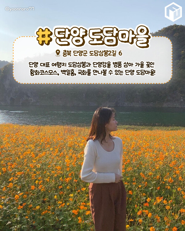 특히 단양강과 도담삼봉을 병풍으로 넓게 펼쳐진 황화 코스모스 군락은 마치 동화 속에 들어온 듯한 아른한 풍경을 자아내 장관을 이루기에 가을 단양 여행시 꼭 방문해야하는 가을꽃 명소입니다.