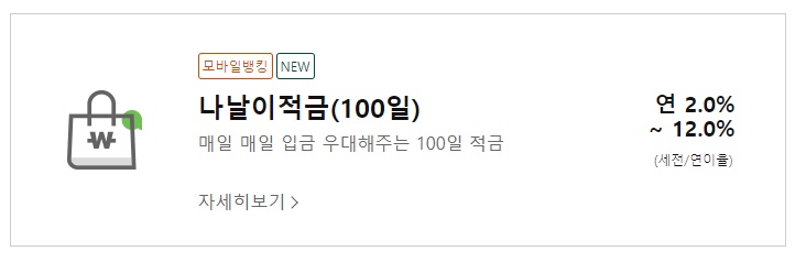 나날이적금은 기본 금리가 2%이지만, 매일 저축을 완료할 경우 최대 12%의 우대 금리를 받을 수 있는 상품입니다. 만기 전 중도해지 시에는 우대금리가 적용되지 않으며, 입금 지연 시에는 지연이자가 발생할 수 있습니다.