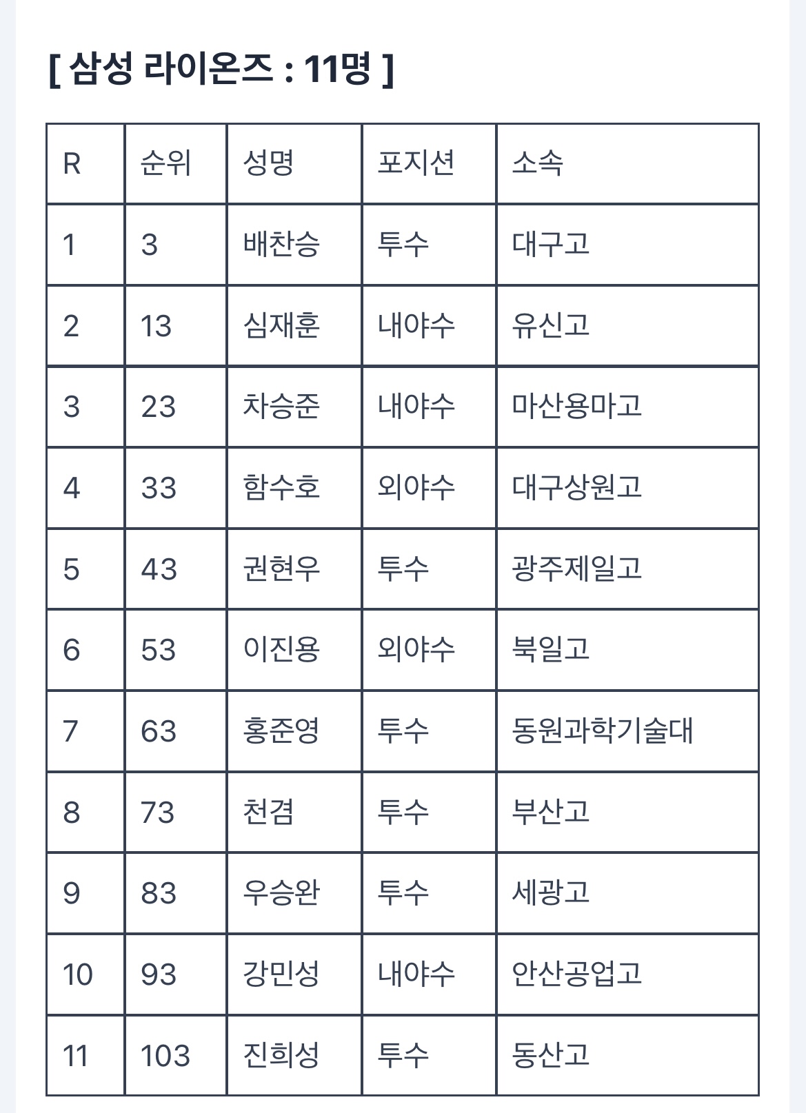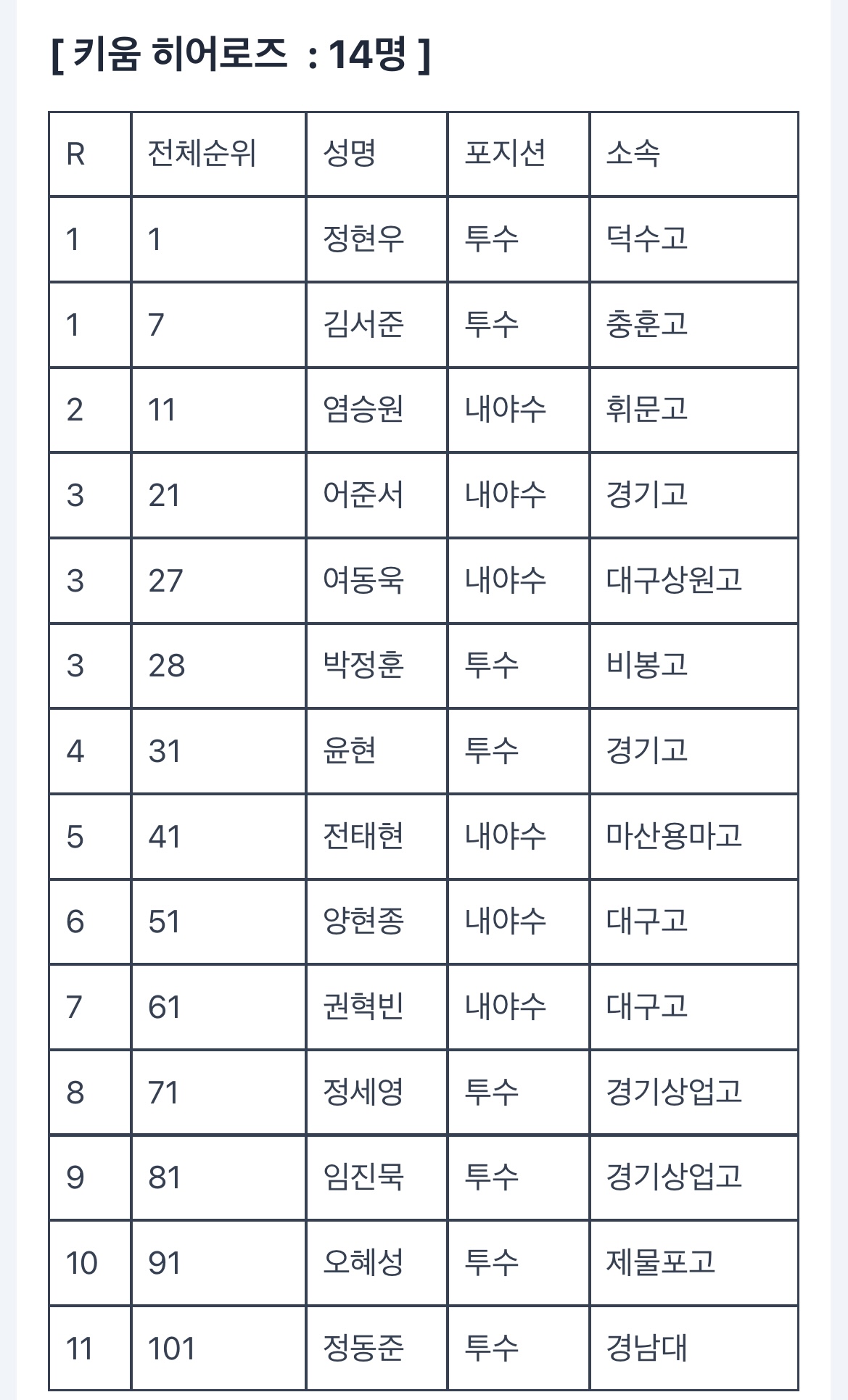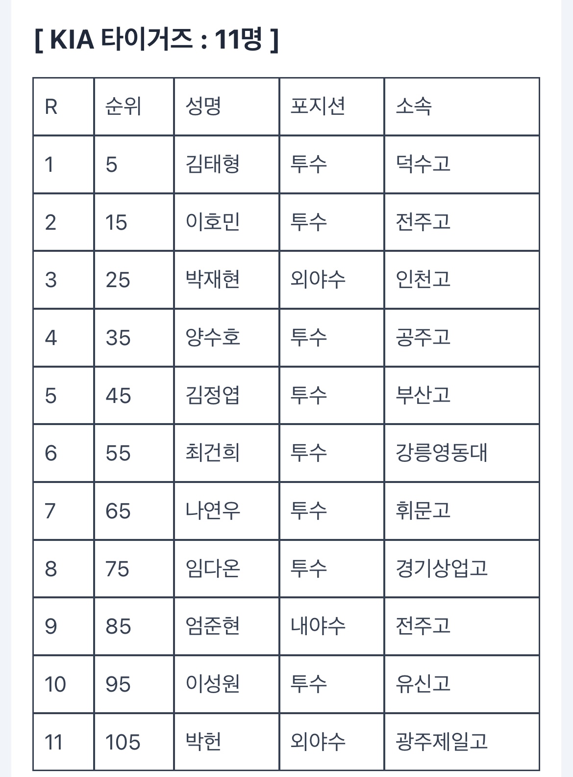 2025 KBO 신인드래프트 결과 1라운드부터 11라운드까지 지명