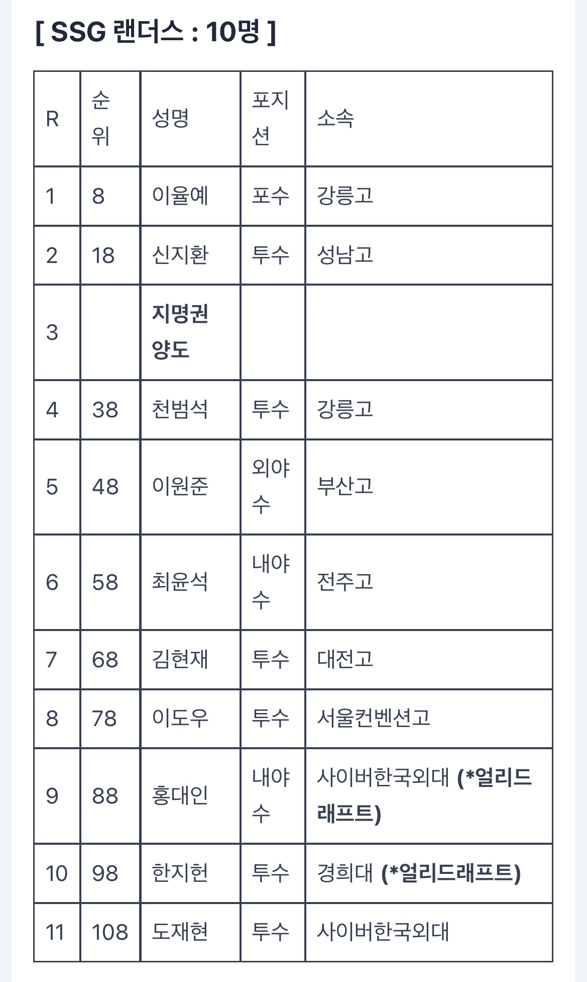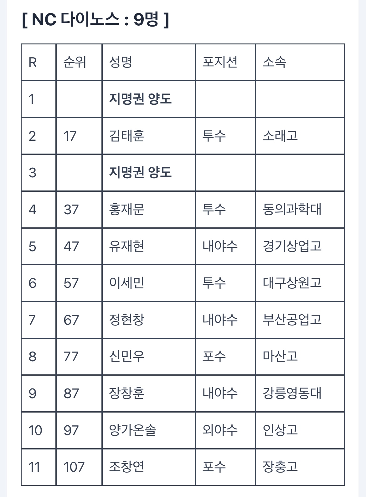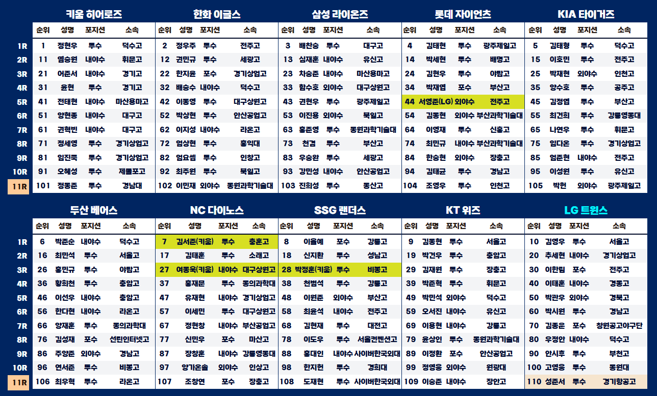 트레이드 통해 지명권 양도양수로 키움14명, LG 12명, SSG, 롯데 10명, NC 9명, 그 외 구단 11명 지명 가능