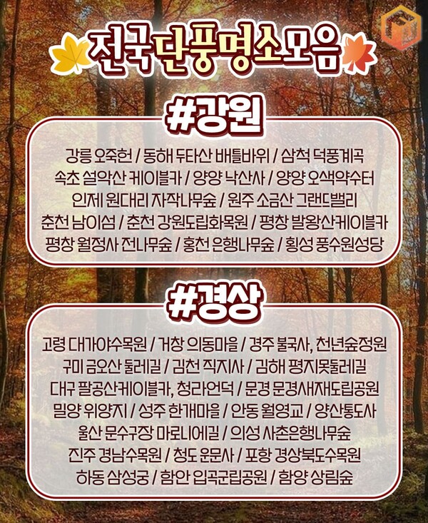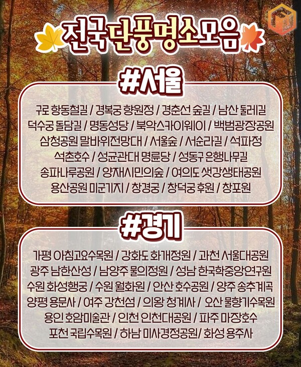 오늘은 2024년 가을 단풍 시즌을 한눈에 볼 수 있는 가을 단풍 지도와 전국의 가을 단풍 명소에 대한 포괄적인 목록을 제공합니다. 가을 단풍은 다른 계절 꽃보다 1개월 반 더 오래 볼 수 있으므로 가을 단풍 여행이나 외출을 여유롭게 계획하세요.