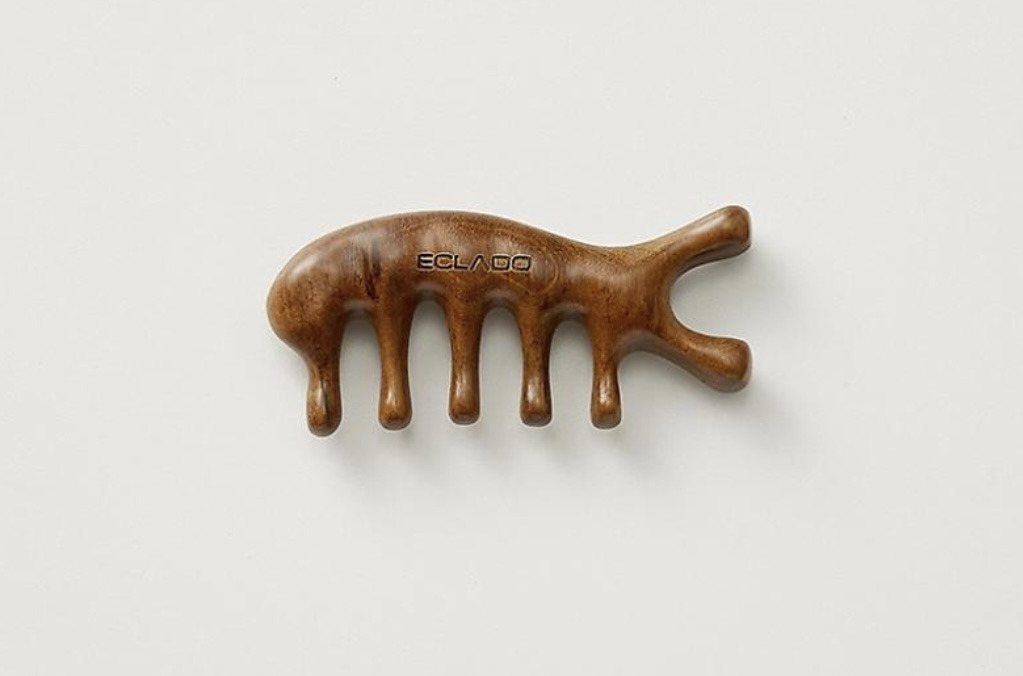 에끌라두의 골든 샌달 우드 괄사'는 빗 모양을 취한 괄사 제품이다. 괄사의 Y자 부위로는 턱과 눈가를, 빗 모양의 부위로는 바디, 페이스, 두피를 부드럽게 쓸어 내리듯 마사지하면서 사용할 수 있다. 깨질 걱정이 없 는 단단한 재질로 만들어져 있으며, 쥐고 사용하기 좋 도록 그립감에 정성을 기해 만들어진 제품이다. 천연 소재로 만들어진 제품으로, 휴대하기 수월한 작은 크 기를 가지고 있다. 본 제품의 온라인 최저가는 8,900 원으로 확인된다.