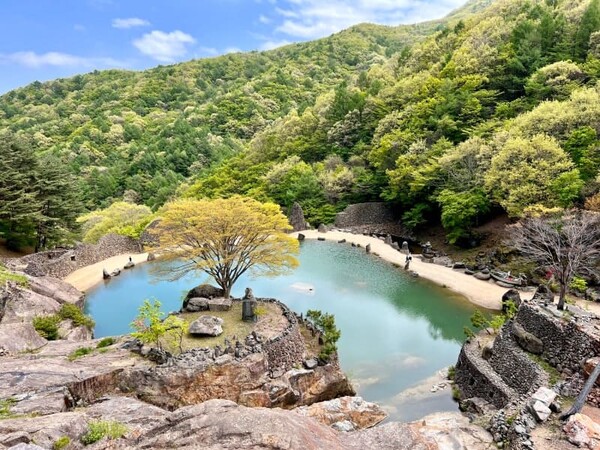 마고성 앞에는 맑은 옥빛의 연못과 돌탑, 지리산의 웅장한 산세가 어우러져 이국적 풍경을 넘어 신비로운 분위기를 자아내는데요. 흐린 날에는 안개가 자욱히 깔려 더더욱 신화 속에서나 볼 법한 풍경이 펼쳐집니다. 오르막이 많아 편한 신발을 신고 방문할 것을 추천하며 입구의 식당에서는 솥뚜껑 파전, 도토리묵, 막걸리, 잔치국수 등을 판매하고 있어 삼성궁을 둘러본 전후로 허기를 달래기에도 좋습니다.