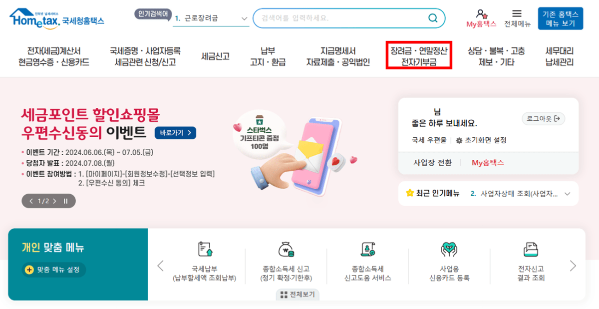 - ‘장려금 · 연말정산 · 전자기부금’ 메뉴 클릭