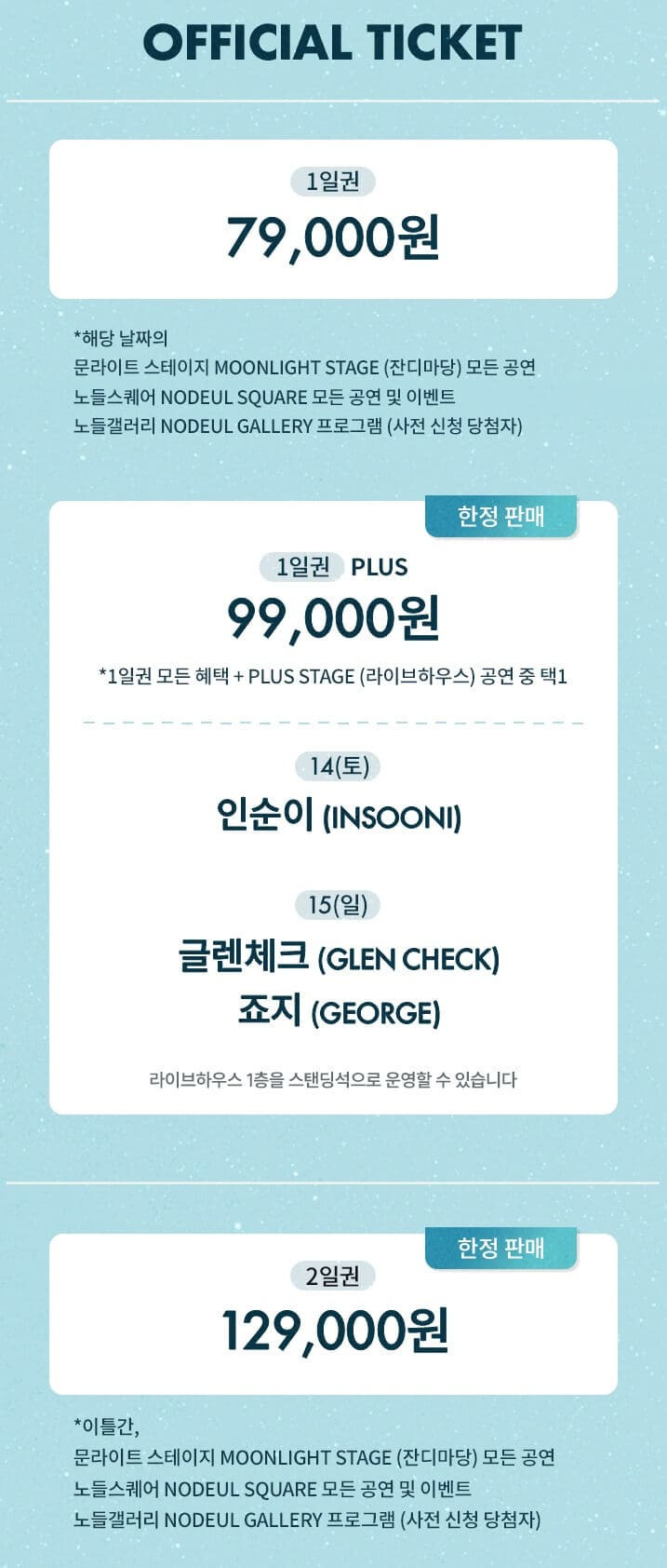 - 1일권 PLUS: 99,000원 (인순이, 글렌체크, 죠지 공연 중 택 1 포함)